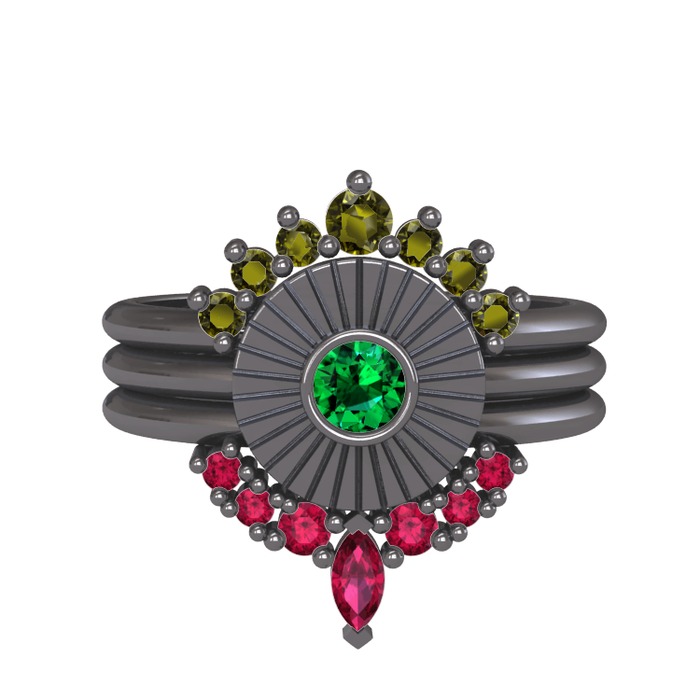 Peridot, yeşil kuvars ve rodolit garnet 925 ayar siyah rodyum kaplama gümüş yüzük