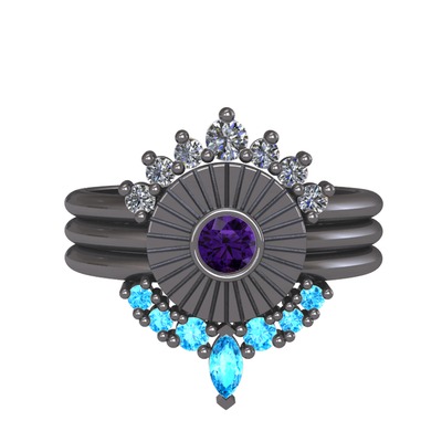 Pırlanta, ametist ve akuamarin 925 ayar siyah rodyum kaplama gümüş yüzük (0.42 karat)