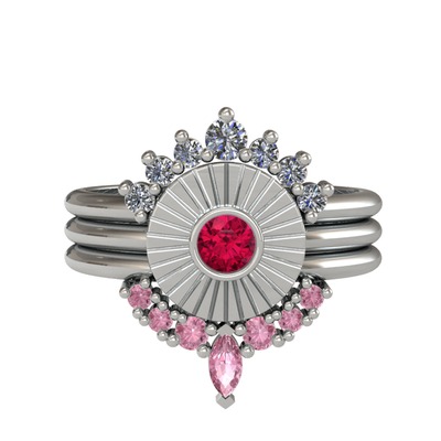 Pırlanta, rodolit garnet ve pembe kuvars 8 ayar beyaz altın yüzük (0.42 karat)
