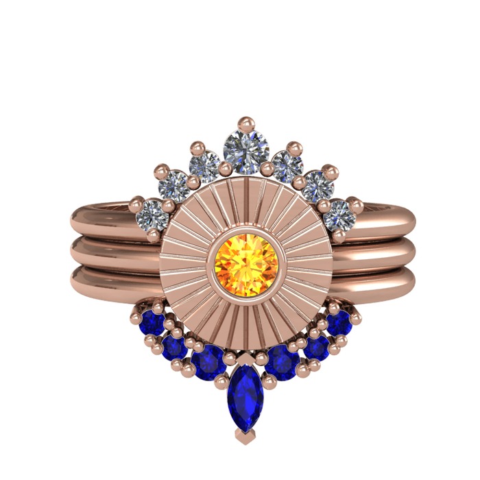 Pırlanta, sitrin ve lab safir 925 ayar rose altın kaplama gümüş yüzük (0.42 karat)