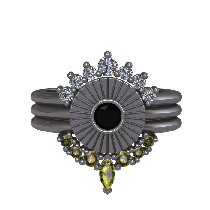 Pırlanta, siyah zirkon ve peridot 925 ayar siyah rodyum kaplama gümüş yüzük (0.42 karat)