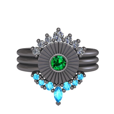 Pırlanta, yeşil kuvars ve akuamarin 925 ayar siyah rodyum kaplama gümüş yüzük (0.42 karat)