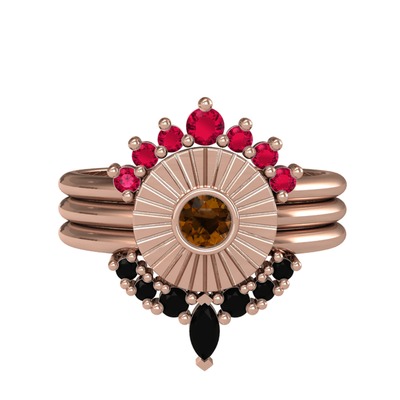 Rodolit garnet, dumanlı kuvars ve siyah zirkon 14 ayar rose altın yüzük