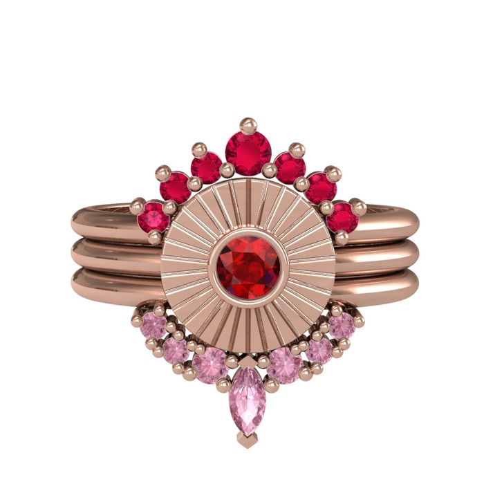 Rodolit garnet, garnet ve pembe kuvars 8 ayar rose altın yüzük
