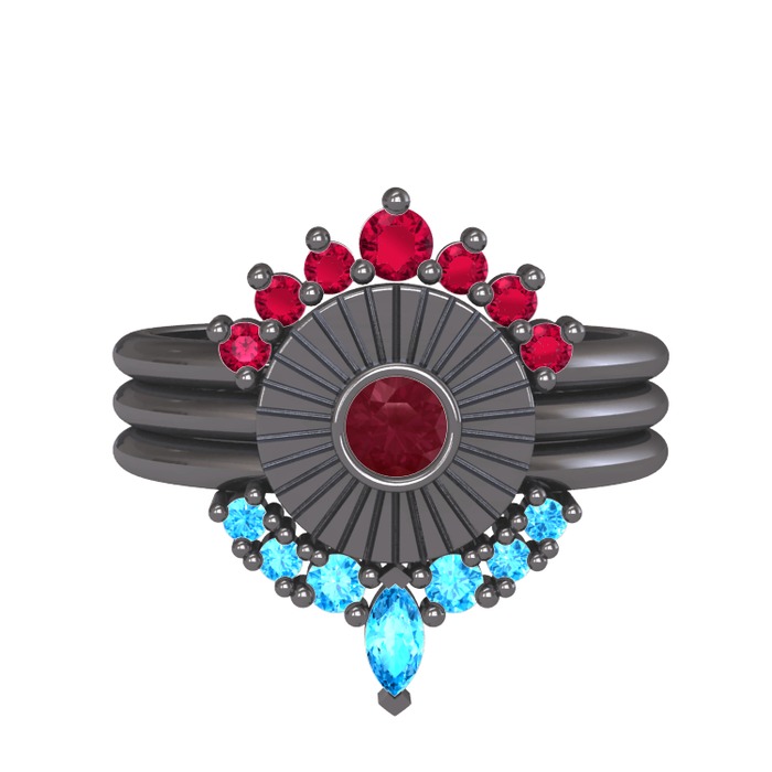 Rodolit garnet, kök yakut ve akuamarin 925 ayar siyah rodyum kaplama gümüş yüzük