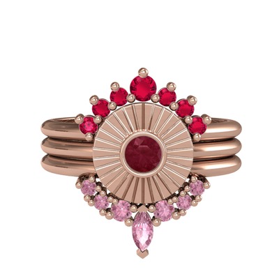 Rodolit garnet, kök yakut ve pembe kuvars 18 ayar rose altın yüzük