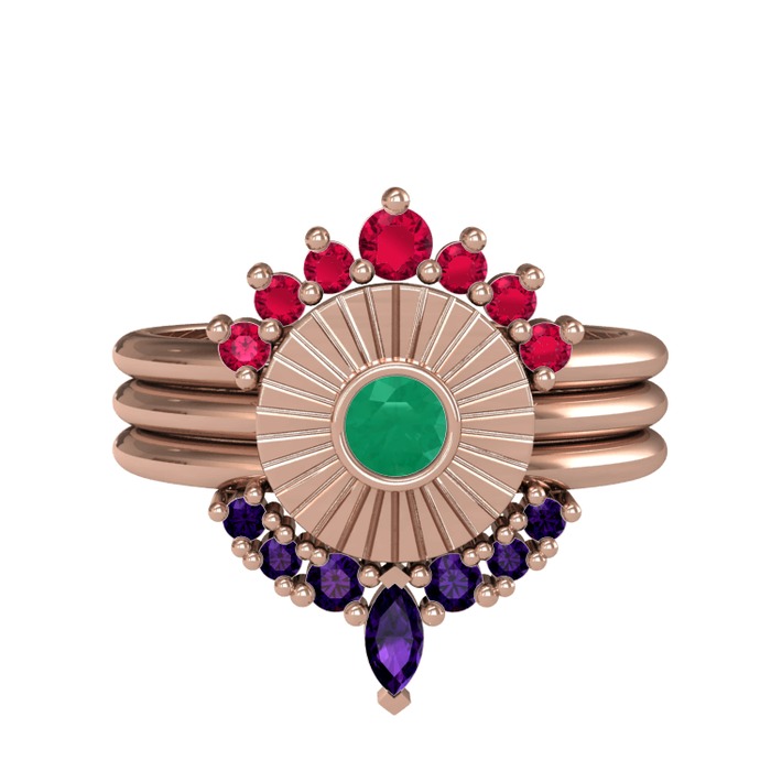 Rodolit garnet, kök zümrüt ve ametist 18 ayar rose altın yüzük