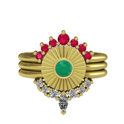 Rodolit garnet, kök zümrüt ve beyaz zirkon 14 ayar altın yüzük