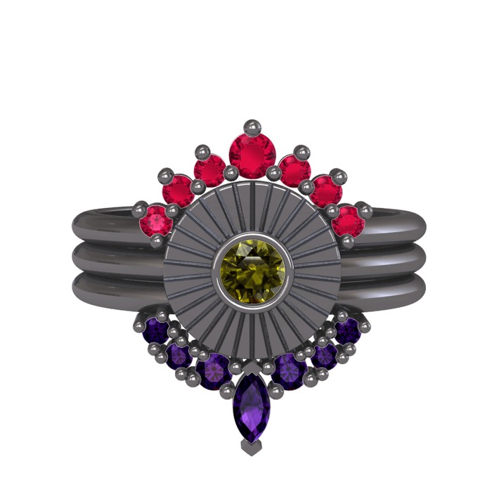 Rodolit garnet, peridot ve ametist 925 ayar siyah rodyum kaplama gümüş yüzük