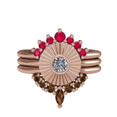 Rodolit garnet, pırlanta ve dumanlı kuvars 14 ayar rose altın yüzük (0.16 karat)