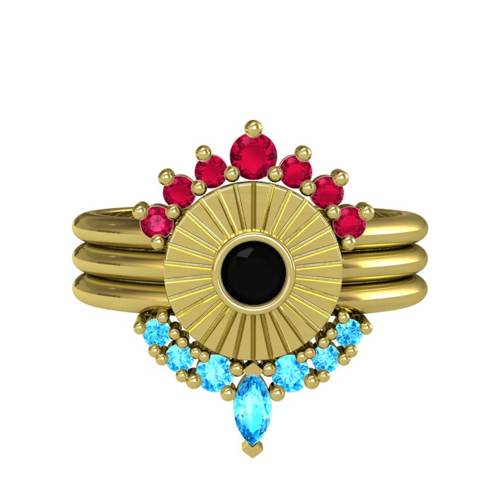 Rodolit garnet, siyah zirkon ve akuamarin 8 ayar altın yüzük