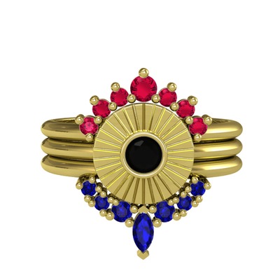 Rodolit garnet, siyah zirkon ve lab safir 925 ayar altın kaplama gümüş yüzük