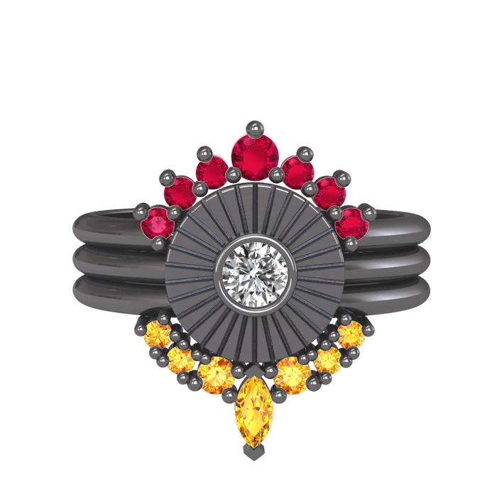 Rodolit garnet, swarovski ve sitrin 925 ayar siyah rodyum kaplama gümüş yüzük
