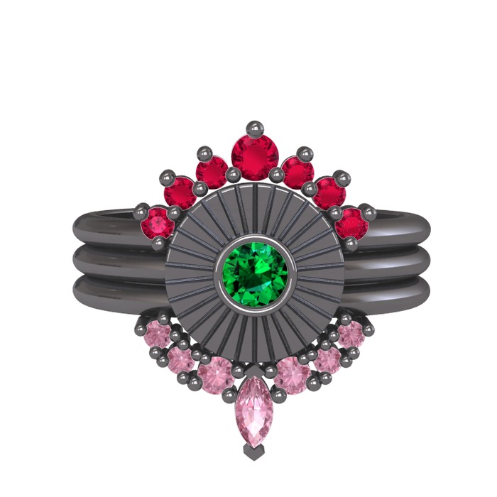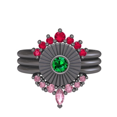 Rodolit garnet, yeşil kuvars ve pembe kuvars 925 ayar siyah rodyum kaplama gümüş yüzük