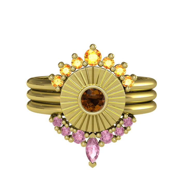 Sitrin, dumanlı kuvars ve pembe kuvars 14 ayar altın yüzük