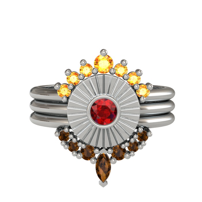 Sitrin, garnet ve dumanlı kuvars 14 ayar beyaz altın yüzük