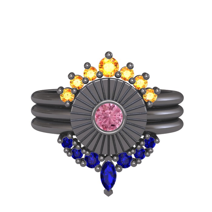 Sitrin, pembe kuvars ve lab safir 925 ayar siyah rodyum kaplama gümüş yüzük
