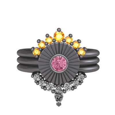 Sitrin, pembe kuvars ve swarovski 925 ayar siyah rodyum kaplama gümüş yüzük