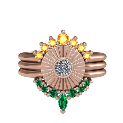 Sitrin, pırlanta ve yeşil kuvars 925 ayar rose altın kaplama gümüş yüzük (0.16 karat)