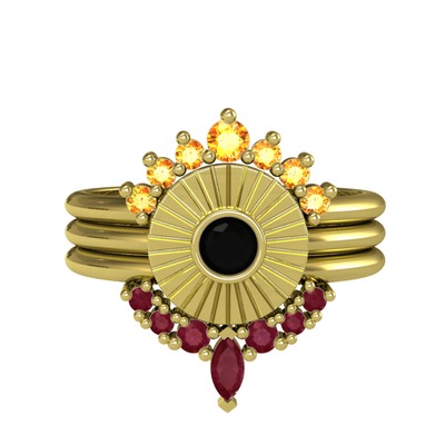Sitrin, siyah zirkon ve kök yakut 8 ayar altın yüzük