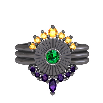 Sitrin, yeşil kuvars ve ametist 925 ayar siyah rodyum kaplama gümüş yüzük