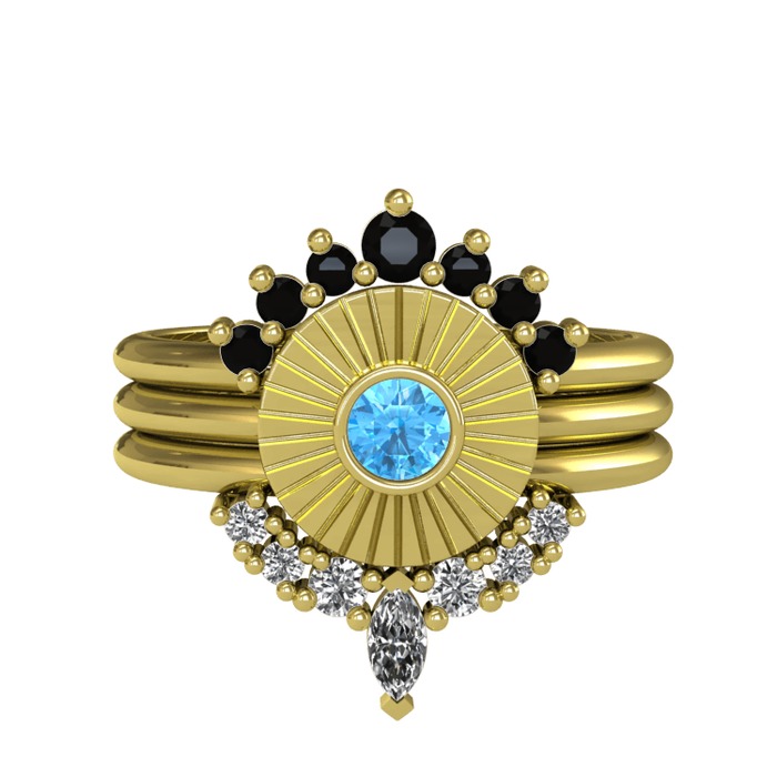 Siyah zirkon, akuamarin ve beyaz zirkon 18 ayar altın yüzük