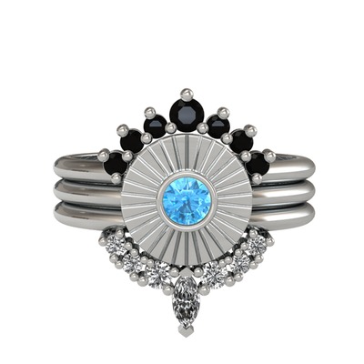 Siyah zirkon, akuamarin ve beyaz zirkon 18 ayar beyaz altın yüzük