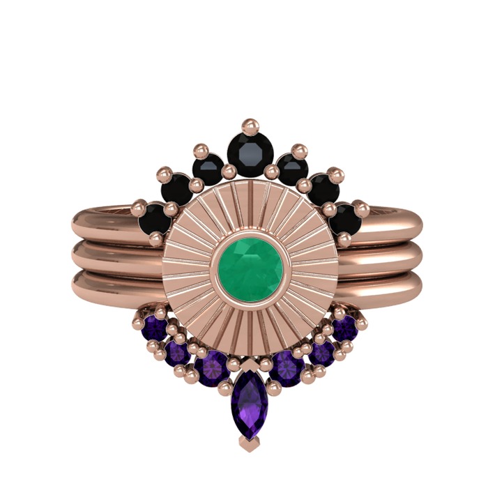 Siyah zirkon, kök zümrüt ve ametist 14 ayar rose altın yüzük