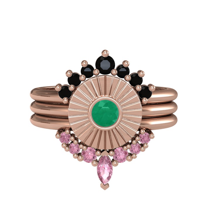 Siyah zirkon, kök zümrüt ve pembe kuvars 8 ayar rose altın yüzük