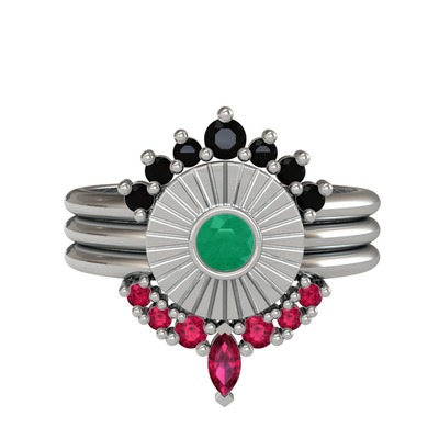 Siyah zirkon, kök zümrüt ve rodolit garnet 14 ayar beyaz altın yüzük