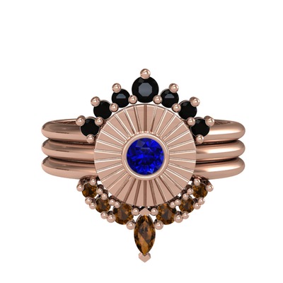 Siyah zirkon, lab safir ve dumanlı kuvars 925 ayar rose altın kaplama gümüş yüzük