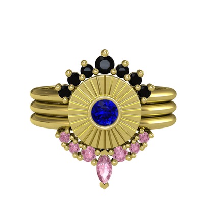 Siyah zirkon, lab safir ve pembe kuvars 14 ayar altın yüzük