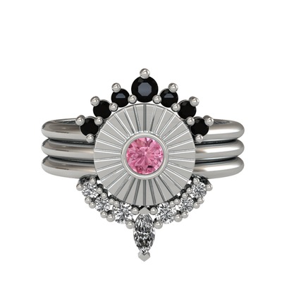 Siyah zirkon, pembe kuvars ve beyaz zirkon 14 ayar beyaz altın yüzük