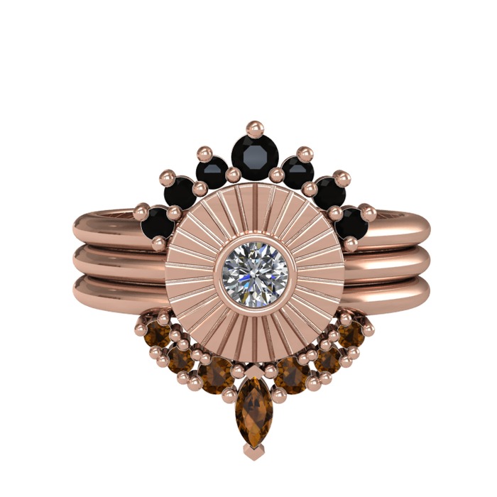 Siyah zirkon, pırlanta ve dumanlı kuvars 14 ayar rose altın yüzük (0.16 karat)