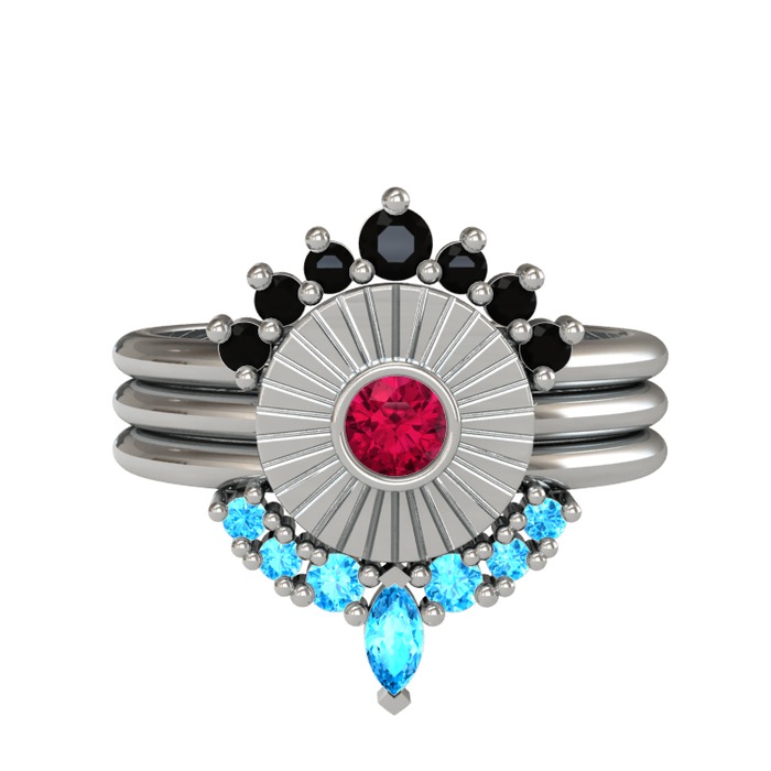 Siyah zirkon, rodolit garnet ve akuamarin 925 ayar gümüş yüzük