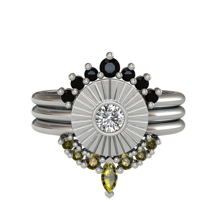 Siyah zirkon, swarovski ve peridot 14 ayar beyaz altın yüzük