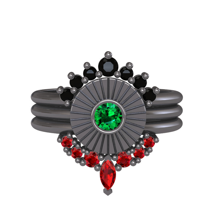 Siyah zirkon, yeşil kuvars ve garnet 925 ayar siyah rodyum kaplama gümüş yüzük