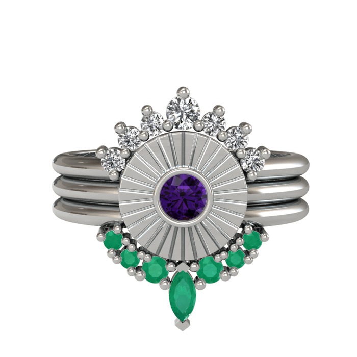 Swarovski, ametist ve kök zümrüt 8 ayar beyaz altın yüzük