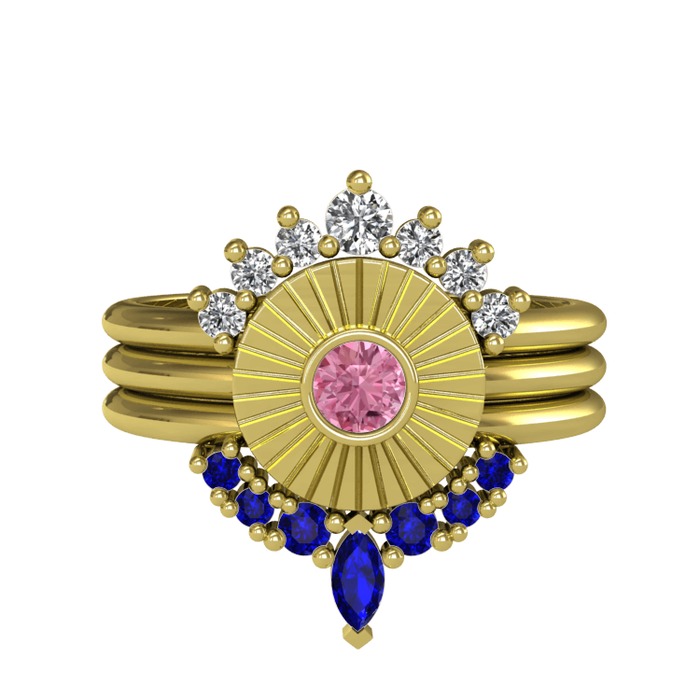 Swarovski, pembe kuvars ve lab safir 8 ayar altın yüzük