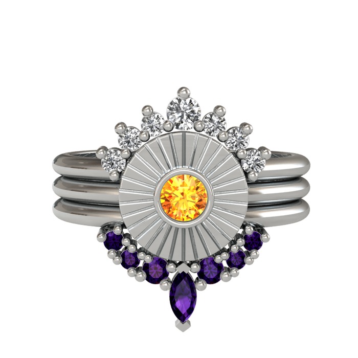 Swarovski, sitrin ve ametist 8 ayar beyaz altın yüzük
