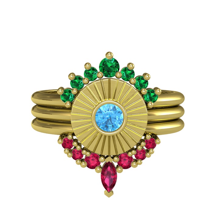 Yeşil kuvars, akuamarin ve rodolit garnet 925 ayar altın kaplama gümüş yüzük