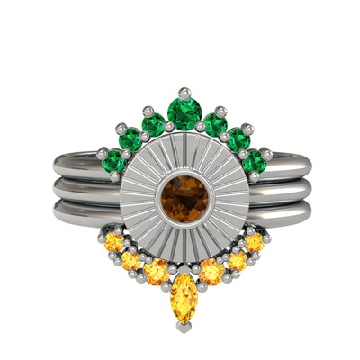 Yeşil kuvars, dumanlı kuvars ve sitrin 14 ayar beyaz altın yüzük