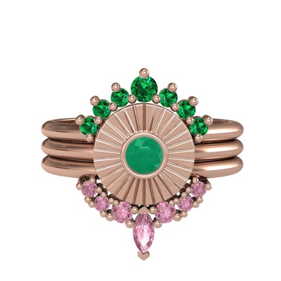 Yeşil kuvars, kök zümrüt ve pembe kuvars 18 ayar rose altın yüzük