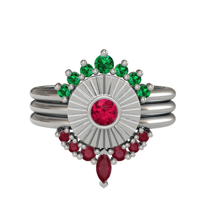 Yeşil kuvars, rodolit garnet ve kök yakut 8 ayar beyaz altın yüzük