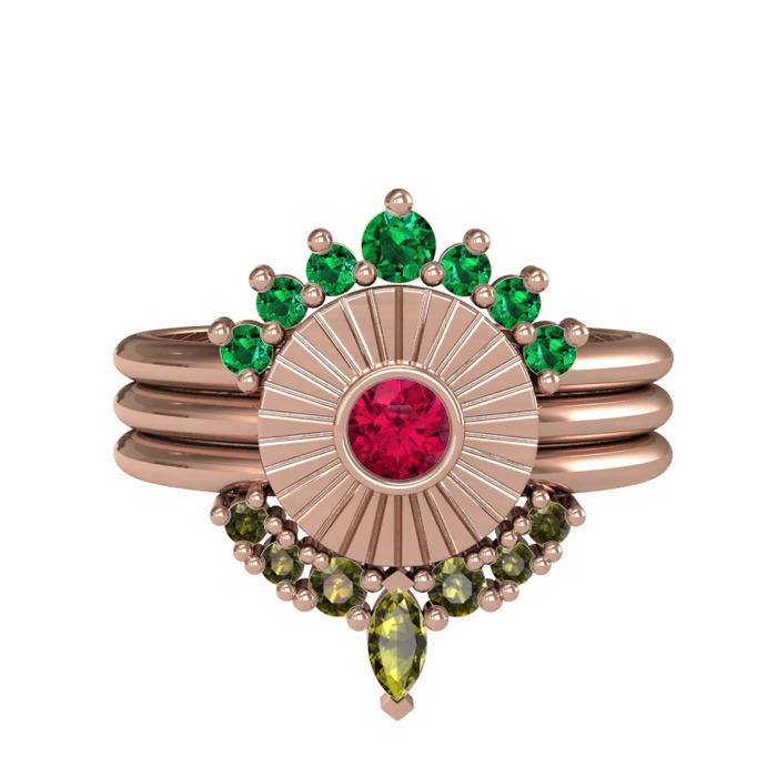 Yeşil kuvars, rodolit garnet ve peridot 8 ayar rose altın yüzük