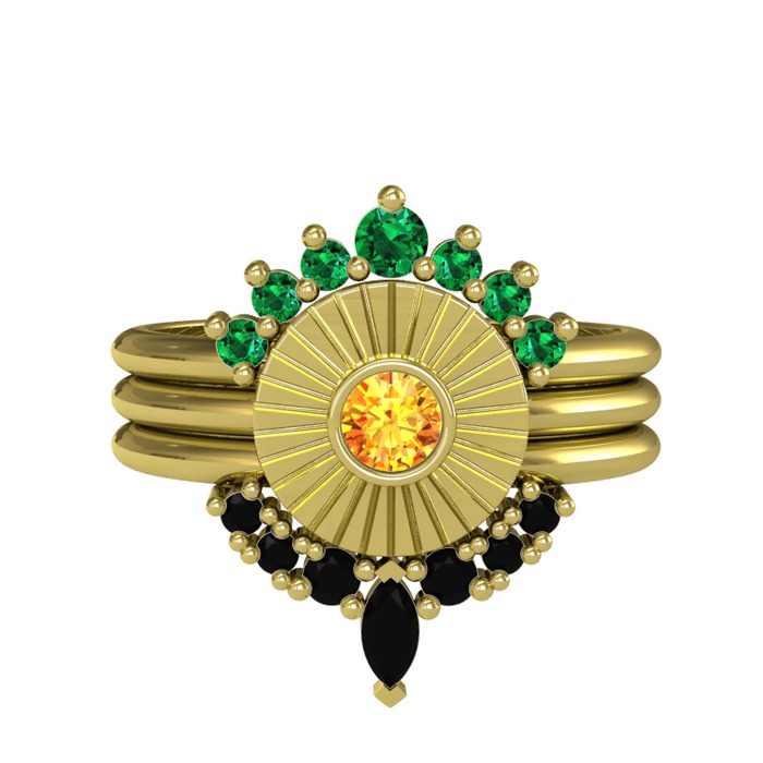 Yeşil kuvars, sitrin ve siyah zirkon 925 ayar altın kaplama gümüş yüzük