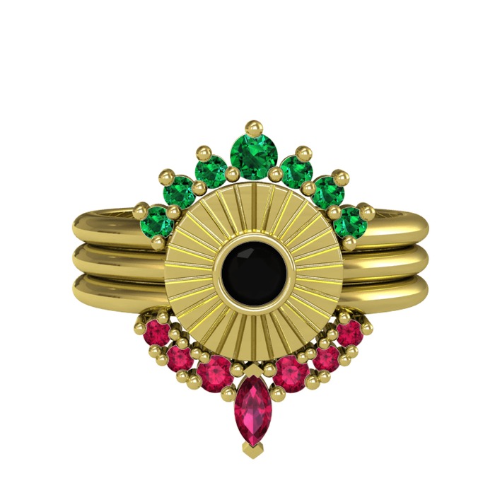 Yeşil kuvars, siyah zirkon ve rodolit garnet 8 ayar altın yüzük