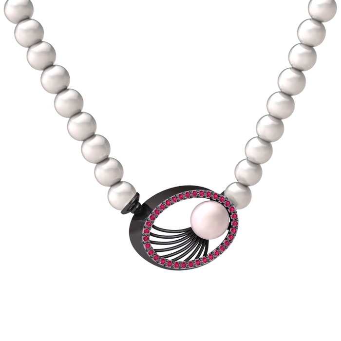 Pembe inci, inci ve rodolit garnet 925 ayar siyah rodyum kaplama gümüş kolye
