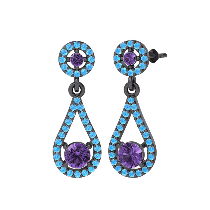 Ametist ve akuamarin 925 ayar siyah rodyum kaplama gümüş küpe