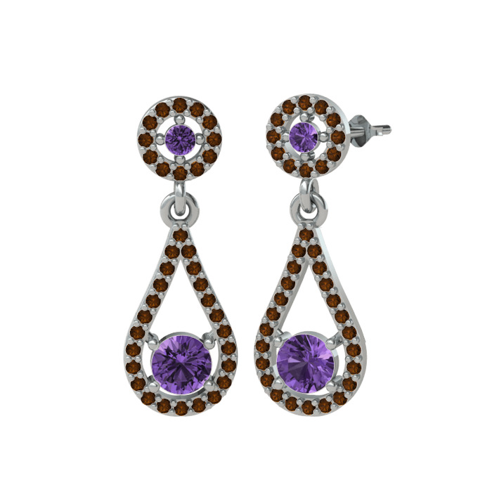 Ametist ve dumanlı kuvars 18 ayar beyaz altın küpe